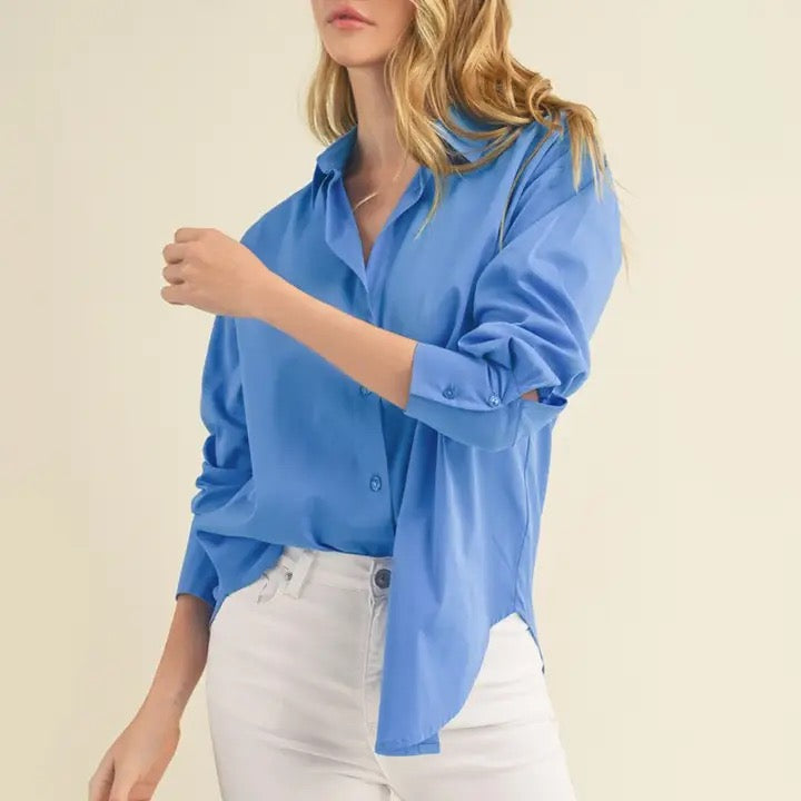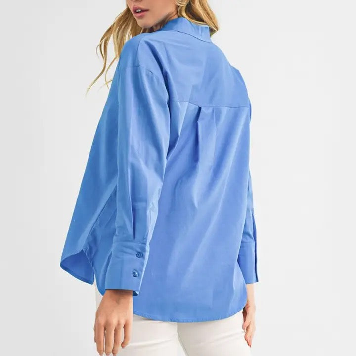 POPLIN BUTTON DOWN LONG SLEEVE COLLAR SHIRT -A button down long sleeve shirt in a cotton poplin woven fabrication featuring a shirttail hem detail - Loose fit