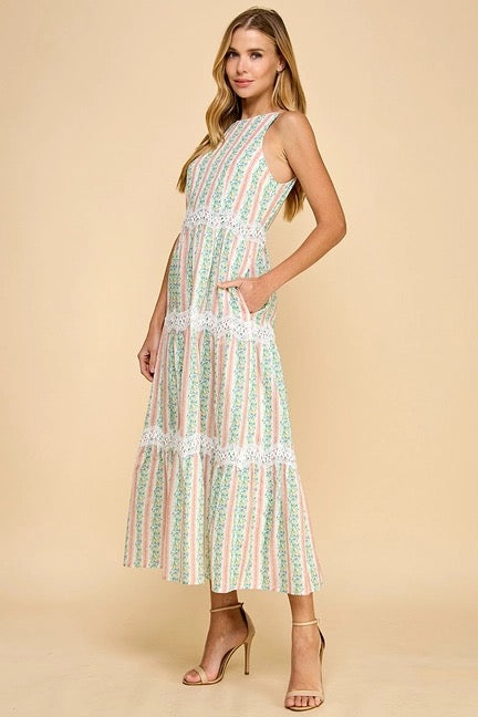 Sleeveless midi dress featuring a floral stripe print with scallop lace inserts for accent. Includes a hidden zipper and is fully lined.