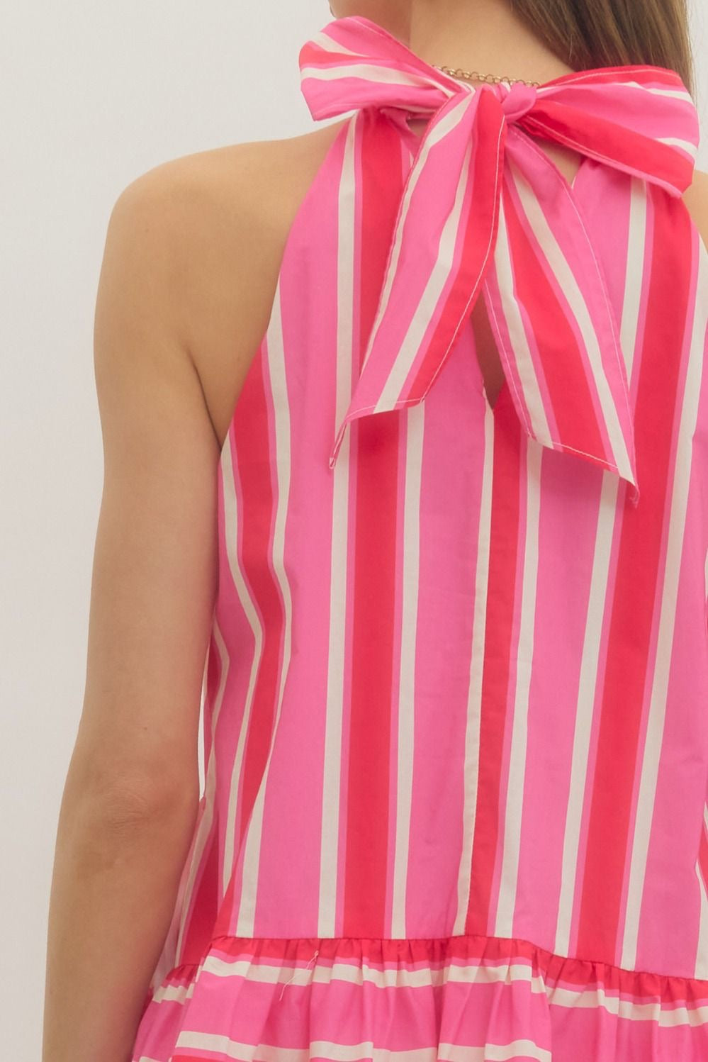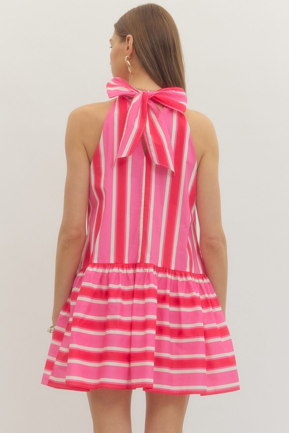 Striped sleeveless mini dress featuring back neck tie. Side pockets. Lined. Woven. Non-sheer. Lightweight.