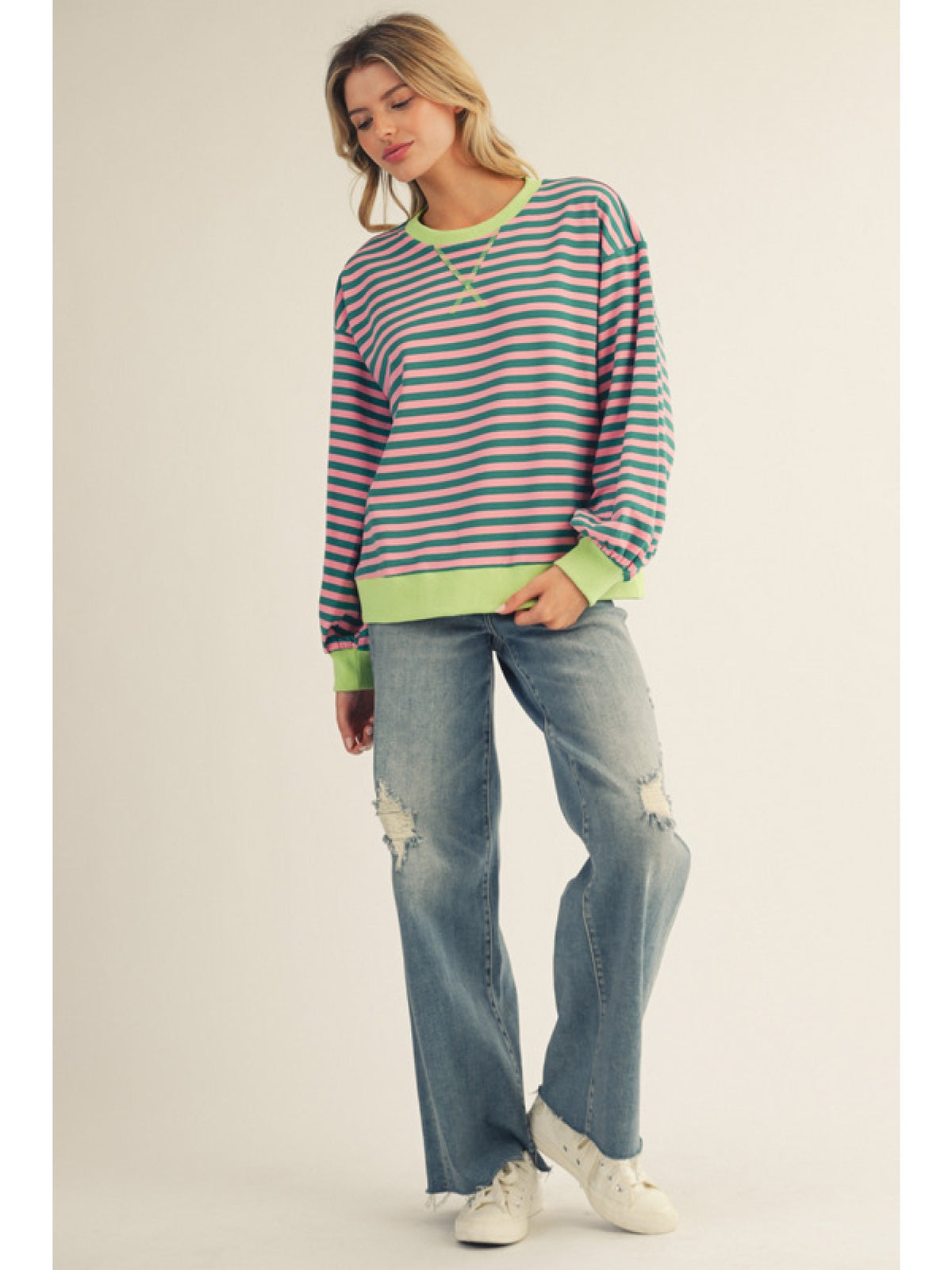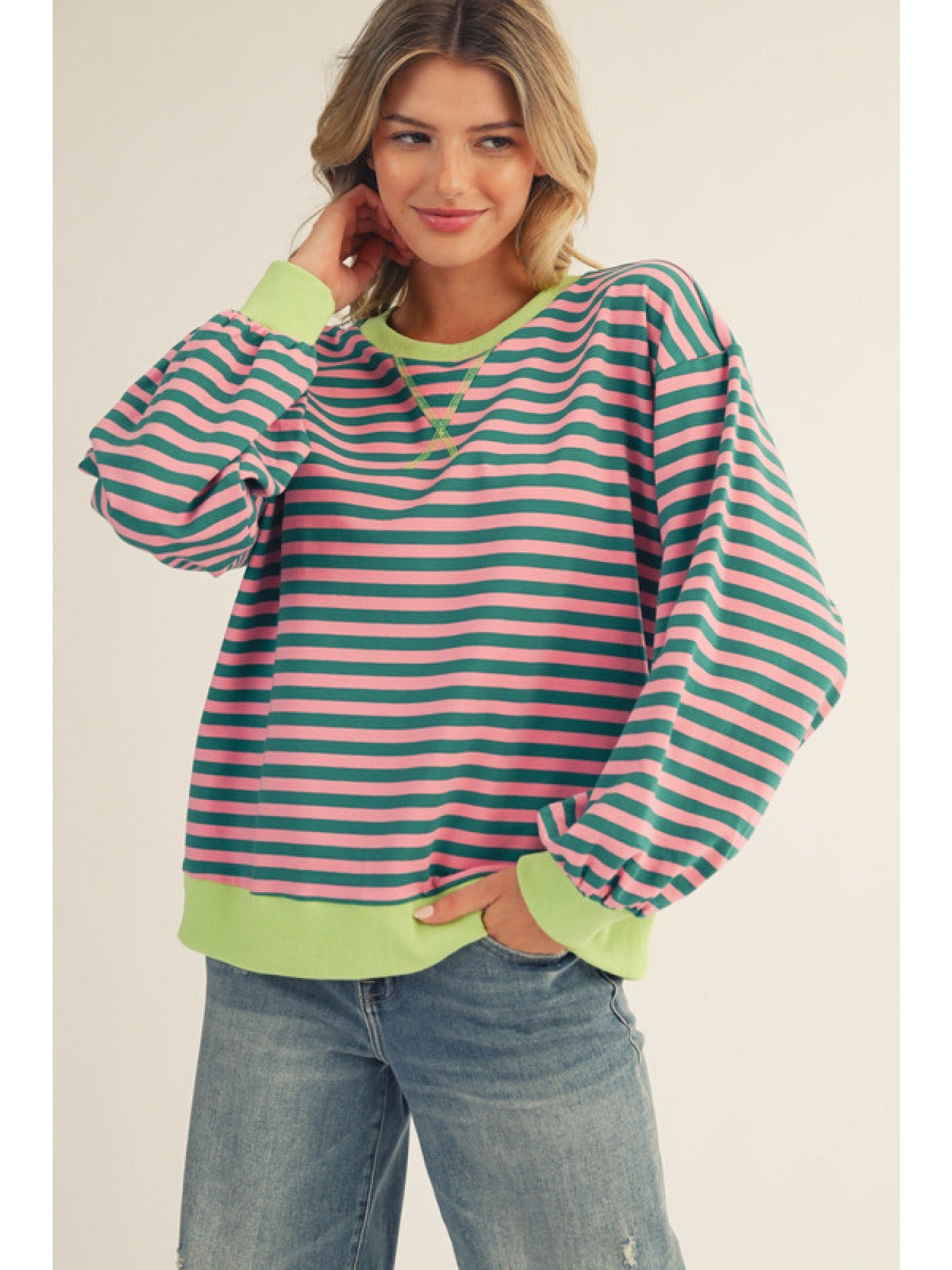 Long puff sleeves stripe sweatshirt with v-notched neckline, solid contrast binding detail.