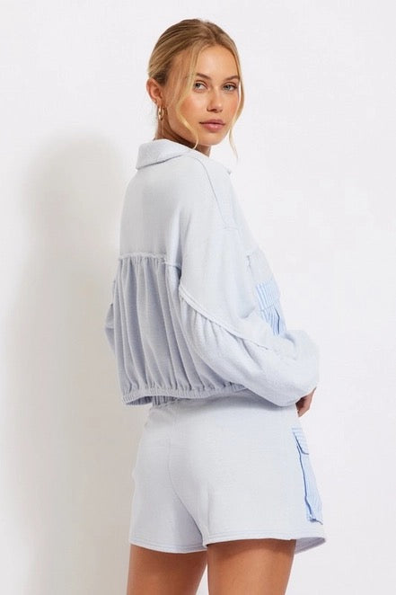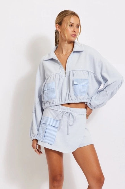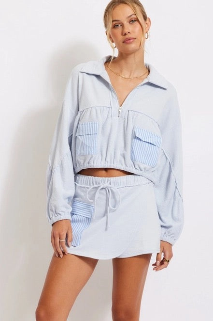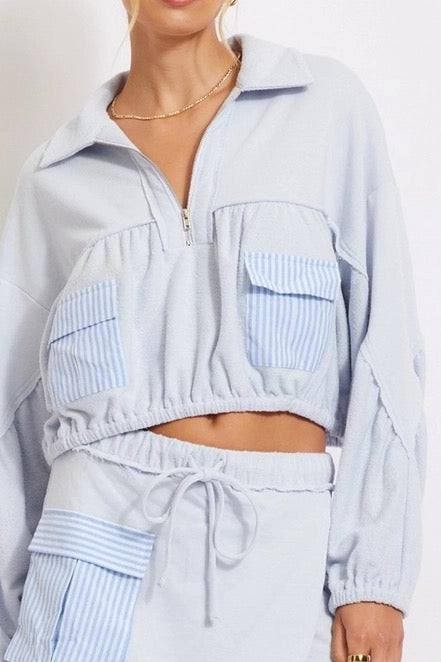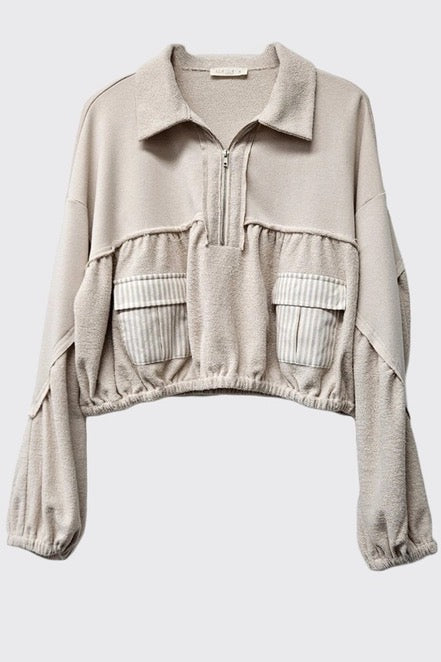 A cropped, cotton terry fabric top featuring striped patch pockets and a half zip.