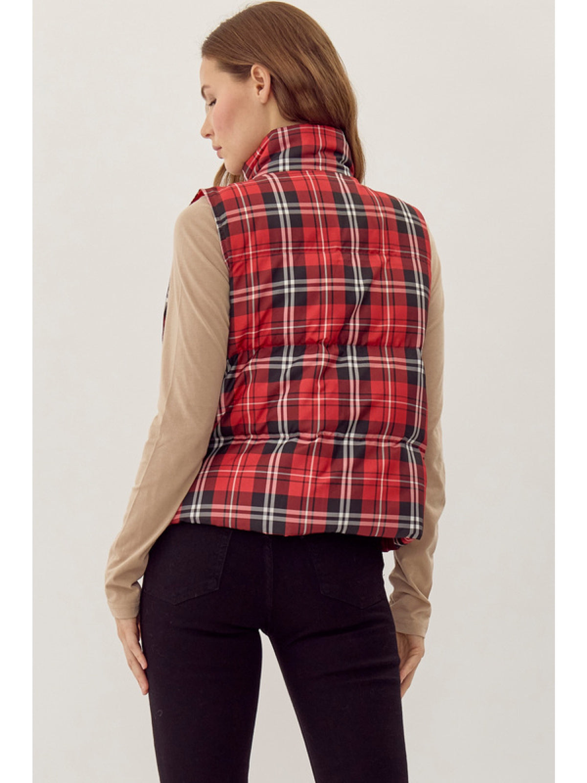 Plaid check print padded vest with high collar, zipper and snap-buttoned closure, and front flap snap-buttoned pockets.